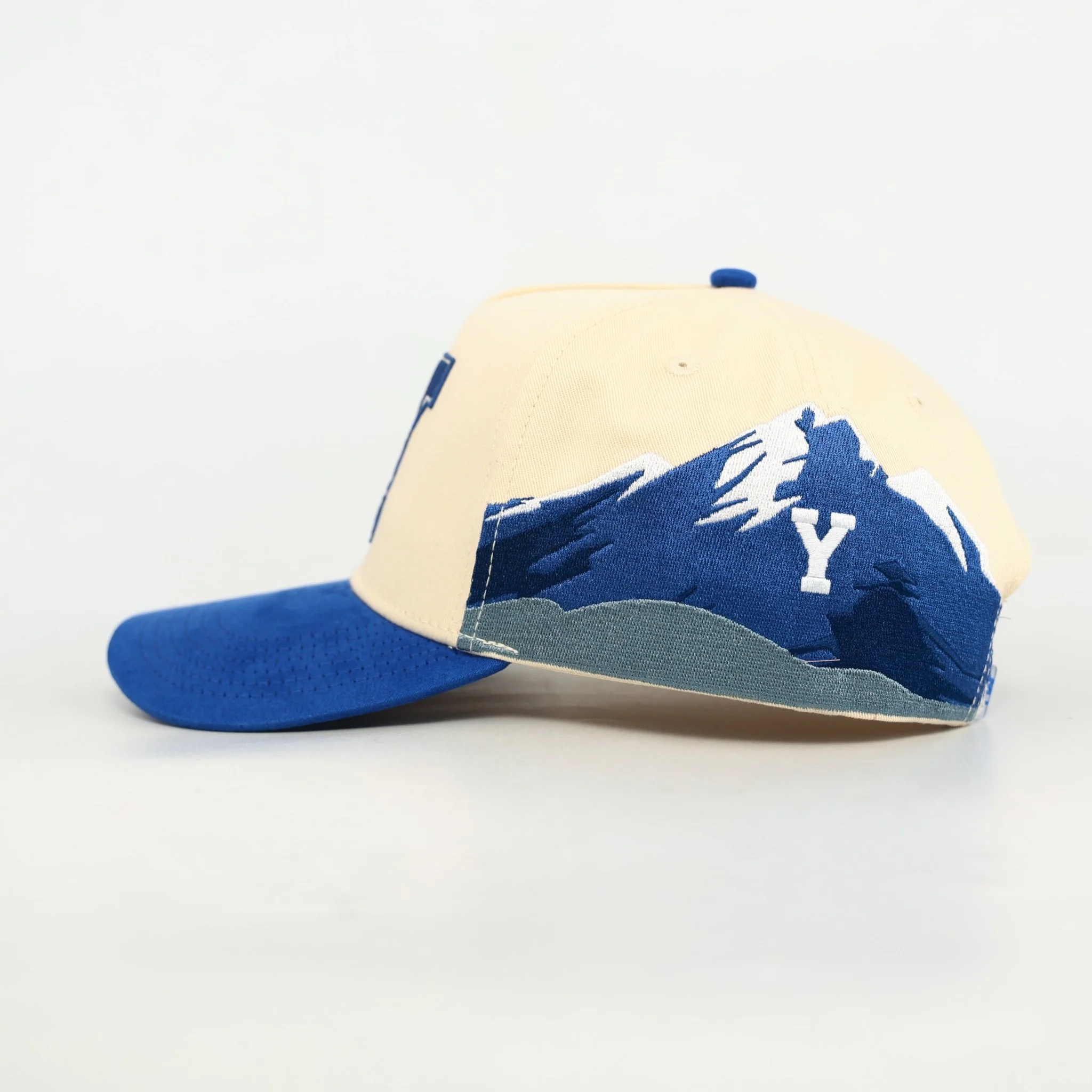 - Natural 5-panel crown with royal blue suede brim